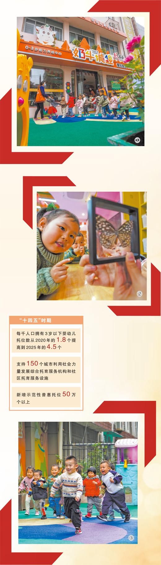 图①:浙江省杭州市拱墅区长庆街道奶牛城堡托育园的孩子们与老师在课间互动。 图②:课堂上,孩子们对蝴蝶标本产生浓厚兴趣。 图③:孩子们在园区奔跑晨练。 图片为人民网记者章勇涛摄 |