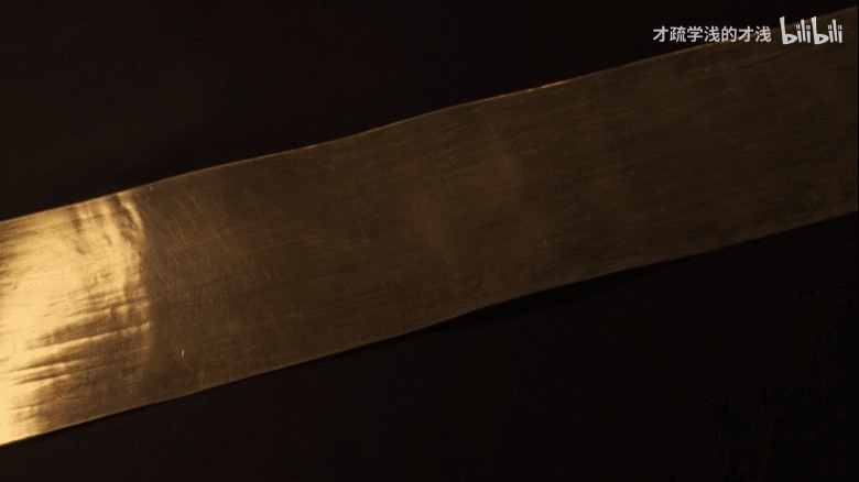 第二次捶打时,才浅直接将金块捶打成扁平长条的带状,再通过裁剪来调整长宽。