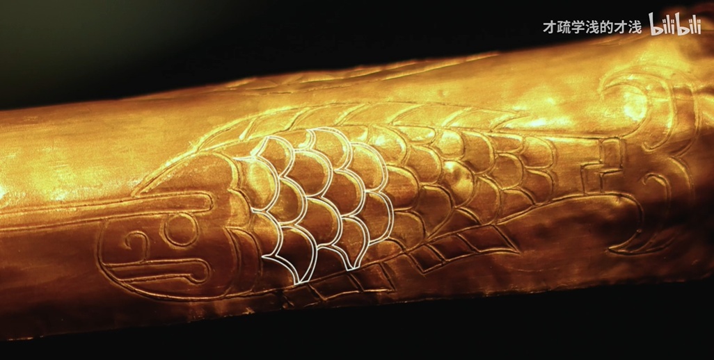 金皮的一端雕刻有46厘米长的纹饰图案,由箭、鸟、鱼和人的形象组成,十分精美。