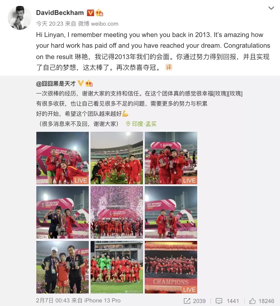 贝克汉姆发微博,恭喜女足张琳艳