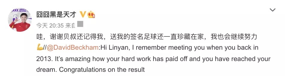 2月8日晚,贝克汉姆转发张琳艳的微博,祝贺她夺冠:“琳艳,我记得2013年我们的会面。你通过努力得到回报,并且实现了自己的梦想,这太棒了。再次恭喜夺冠。”