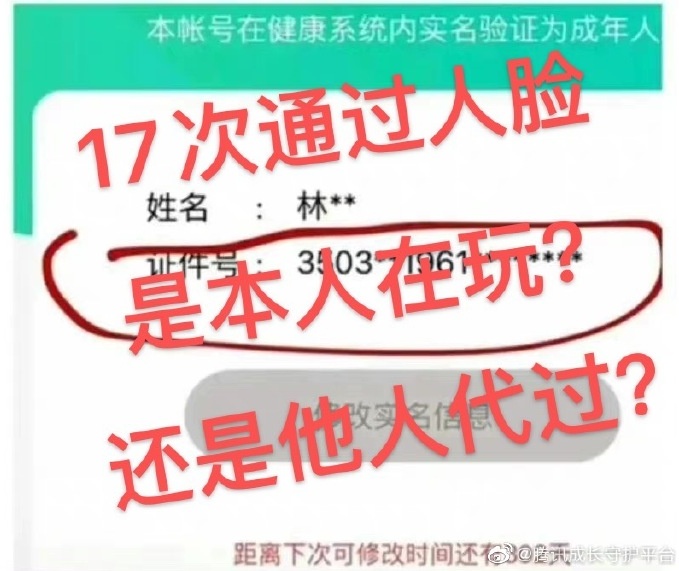 9月9日中午,腾讯成长守护平台对记者回应该事件,表示该账号曾屡次被判定为疑似未成年人操作,前后共计通过17次人脸识别,同时系统反馈结果比对公安数据源均保持一致。甚至在9月1日防沉迷新规正式生效后,该账号也有2次通过人脸识别验证记录。 但是否属于“他人代过人脸”,腾讯表示,无法判断,也没有相关权限在企业后台数据之外做进一步确认。
