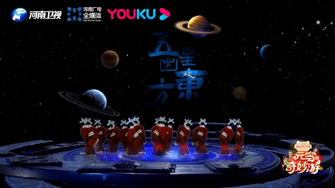 在这一篇章中,既有民俗符号的直接表达,也有更为含蓄的情感表达。就像舞蹈《五星出东方》,灵感就来源于文物“五星出东方利中国”汉代织锦,身着精巧、考究的“盛世衣冠”的舞者们一展大汉气魄,融合天文奇观的特效设计,在更广阔情感维度上诠释“元”主题。