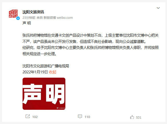 1月19日晚间,沈阳市文化旅游和广播电视局发布声明,称张氏帅府博物馆在交通卡文创产品设计中策划不当,上级主管单位沈阳市文博中心把关不严,该产品虽尚未公开发行发售,但造成不良社会影响,现向公众诚挚道歉。