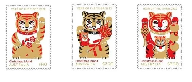 2022年1月6日,澳大利亚邮政发行“虎年”邮票一套3枚,小全张一枚。图案为“招财虎”。