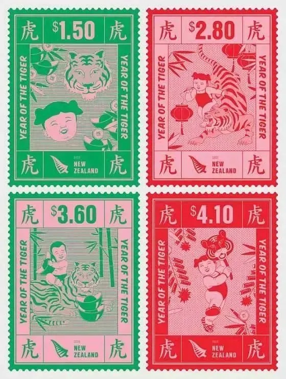 2021年12月1日,新西兰邮政发行“虎年”邮票一套4枚,小全张一枚。图案为中国传统年画。