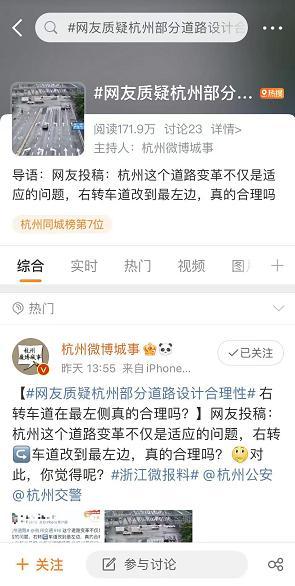 最近,有网友质疑杭州部分道路右转车道放在最左侧的话题,冲上微博同城热搜。