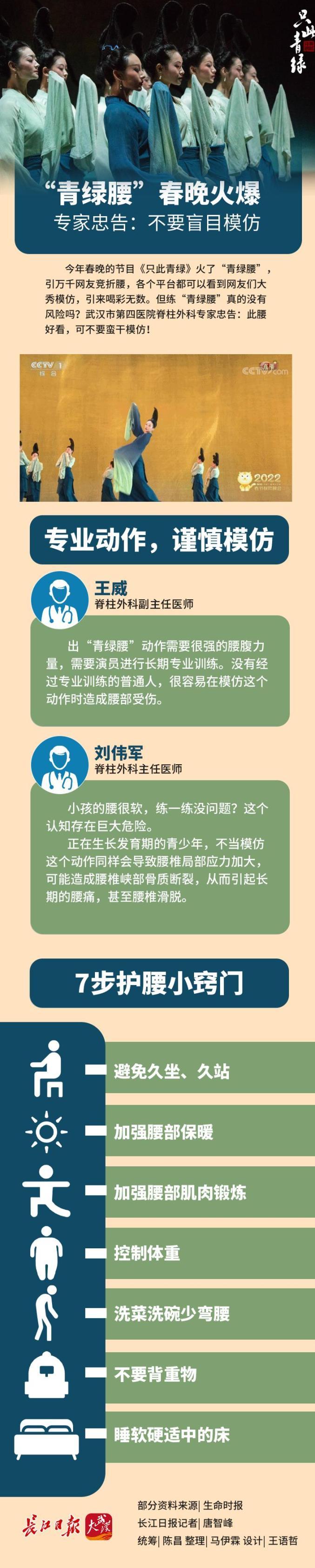 武汉市第四医院脊柱外科副主任医师王威博士介绍,台上一分钟台下千日功,做出“青绿腰”动作需要很强的腰腹力量,都是通过演员日积月累训练出来的。没有经过专业训练的普通人,很容易在模仿这个动作时造成腰部受伤。