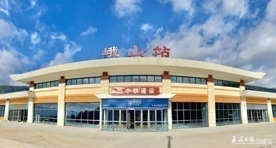 峨山站以“彩云之南、彝珠峨山”为设计理念,整体造型源于对峨山彝族文化传统元素的发掘提炼,端庄舒展的大屋顶使站房更加气派,体现峨山独特秀气的地理与人文风情。候车大厅以花鼓舞形态、当地花腰彝族服饰和彝族图腾为装饰元素。