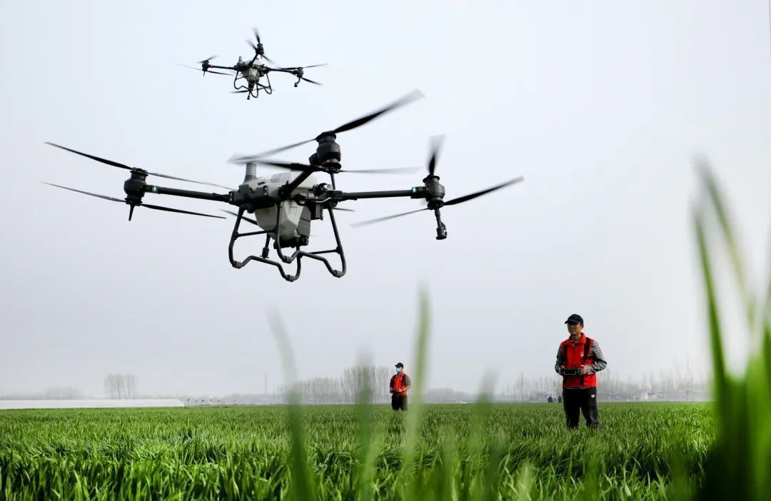 河南尉氏县邢庄乡农机服务队利用无人机给小麦喷洒叶面肥。李新义摄