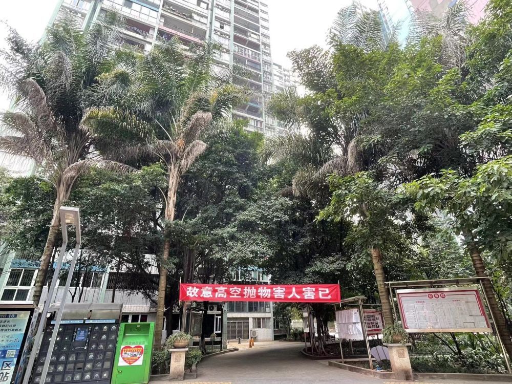 重庆某小区门口的治理高空抛物宣传条幅。(受访者供图)