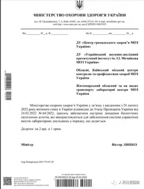 俄罗斯国防部发布的有关乌克兰卫生部要求在2月24日销毁实验病原体样本的文件。