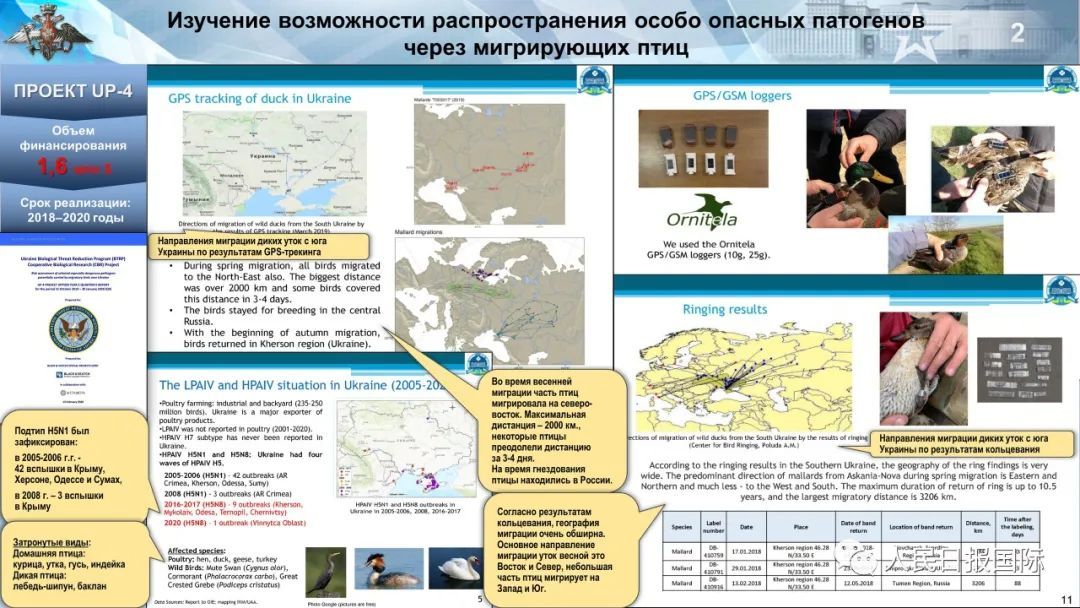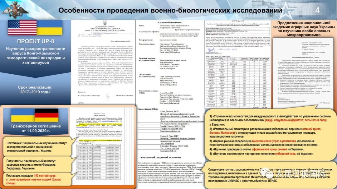 根据基里洛夫介绍,UP-4项目持续到2020年,目的是研究通过候鸟进行特别危险的感染传播的可能性,包括能导致人类致死率高达50%的高致病性禽流感H5N1以及纽卡斯尔病毒。P-781项目将蝙蝠视为潜在生物武器制剂的载体。研究的是能够从蝙蝠传播给人类的细菌和病毒等病原体,包括鼠疫、钩端螺旋体病、布鲁氏菌病、冠状病毒和丝虫病毒。UP-8项目主要研究刚果出血热和汉坦病毒。项目的文件资料驳斥了美方此前的在乌克兰生物实验中“只有乌克兰科学家”的说法,并证明所有高风险的研究都是“在美国专家的直接监督下进行”。有关资料清楚地表明,美国国防部直接为研究提供了经费。