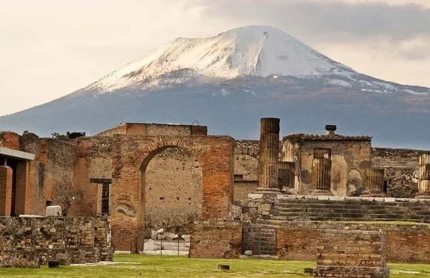 庞贝古城遗址与远处的维苏威火山