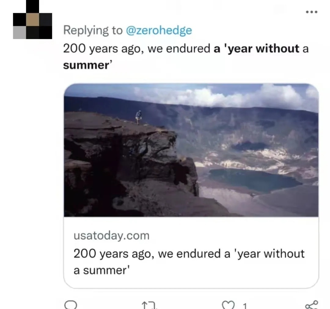 与之类似的,还有1991年菲律宾皮纳图博火山喷发,此次火山喷发后,全球气温下降了0.5摄氏度。