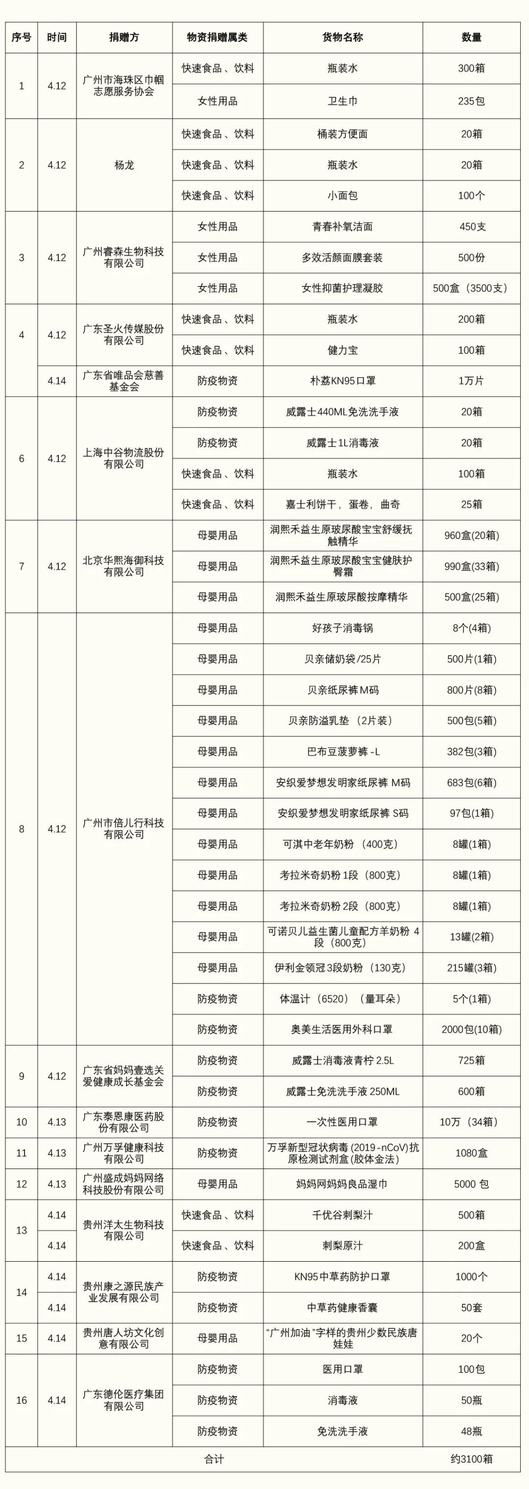 在广州市妇联的广泛发动、广州市妇女儿童福利会倡议下,截止到2022年4月16日,共收到社会各界爱心企业和人士捐赠的防疫物资有40多种,价值约180万元。为了将这一批防疫物资最快速度送达有需要的防疫一线,在广州市妇联积极发动下,“广州家姐”巾帼志愿者们及妇联系统干部、工作人员等,第一时间响应号召,纷纷放下家中的事情,不分白天黑夜和节假日时间,车送手扛,或搬运或清点物资,及时接力,将一车车防疫物资安全、快速地送至各区防疫一线。