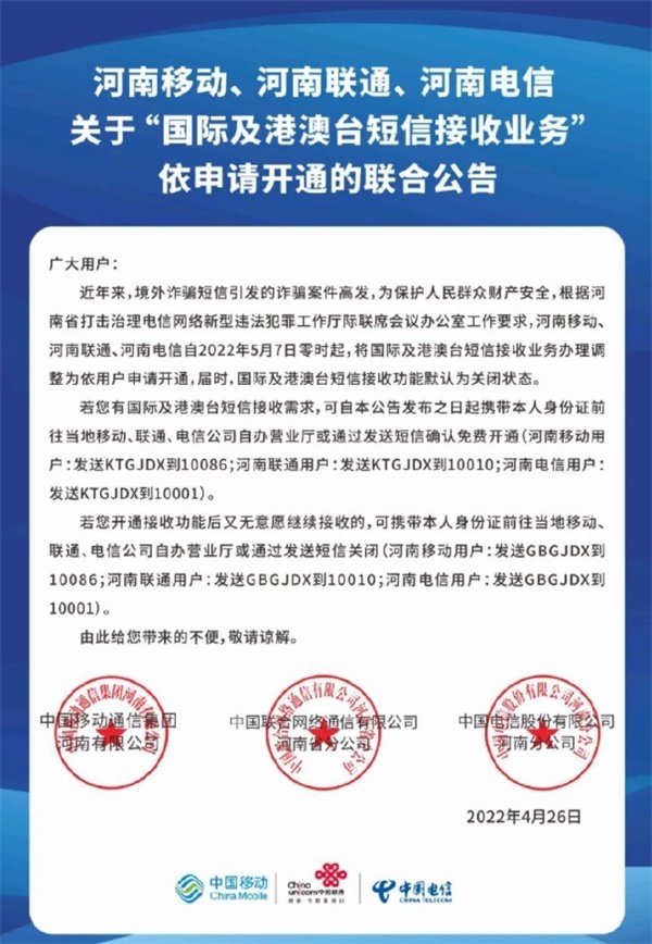 日前,河南移动、河南联通、河南电信发布公告,自5月7日已将国际及港澳台短信接收功能默认为关闭状态。