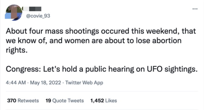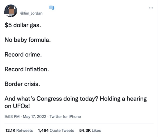 5美元/加仑的汽油;买不到婴儿配方奶粉;创纪录的犯罪记录以及通货膨胀;边境危机......而国会今天在做什么?举行UFO听证会!
