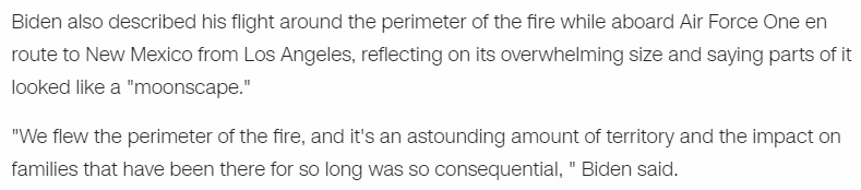 △当天,拜登乘坐专机飞往新墨西哥州,在着陆前,飞机绕着受灾区域上空盘旋,拜登形容其中一部分区域看起来像“月球景观”。(CNN报道截图)
