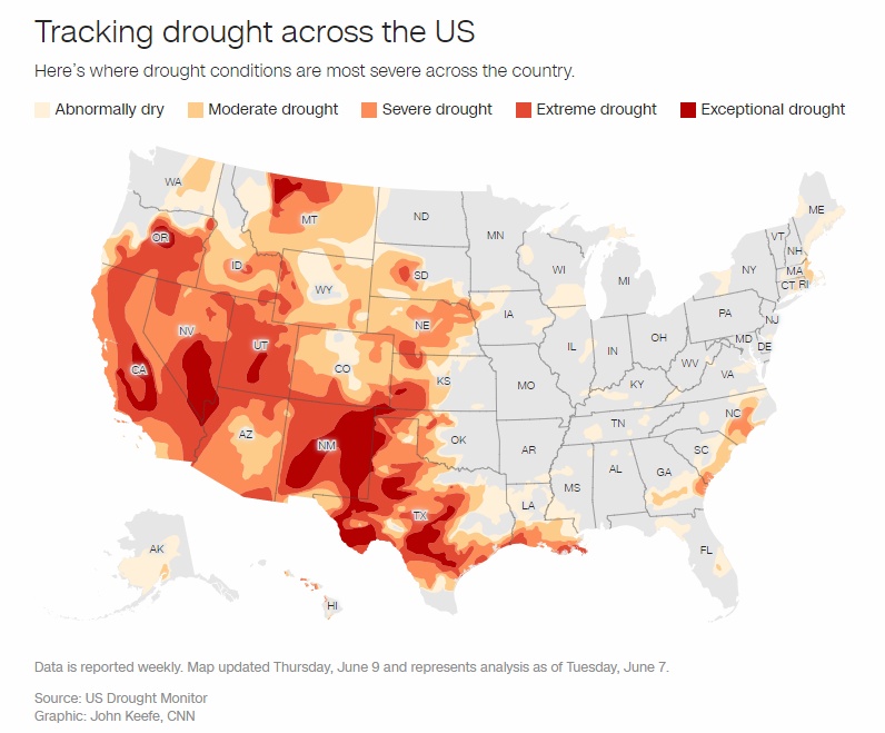 △根据美国干旱监测机构的最新报告,该国西部和南部多个州的干旱级别达到最高级