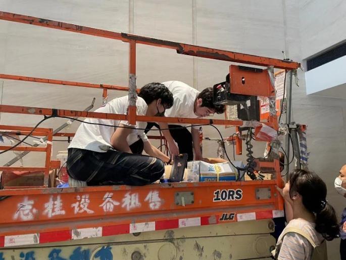 现场已有工友在帮患者做心肺复苏。同学们迅速判断触电工人的生命体征,同时为触电工人清理口腔分泌物,防止分泌物窒息。叶青同学立即为患者进行胸外按压和人工呼吸,韩梦佳同学协助其为病人进行复苏,郭霁峰同学与梁江慧同学马上跑到医学园大楼外取来AED装置。