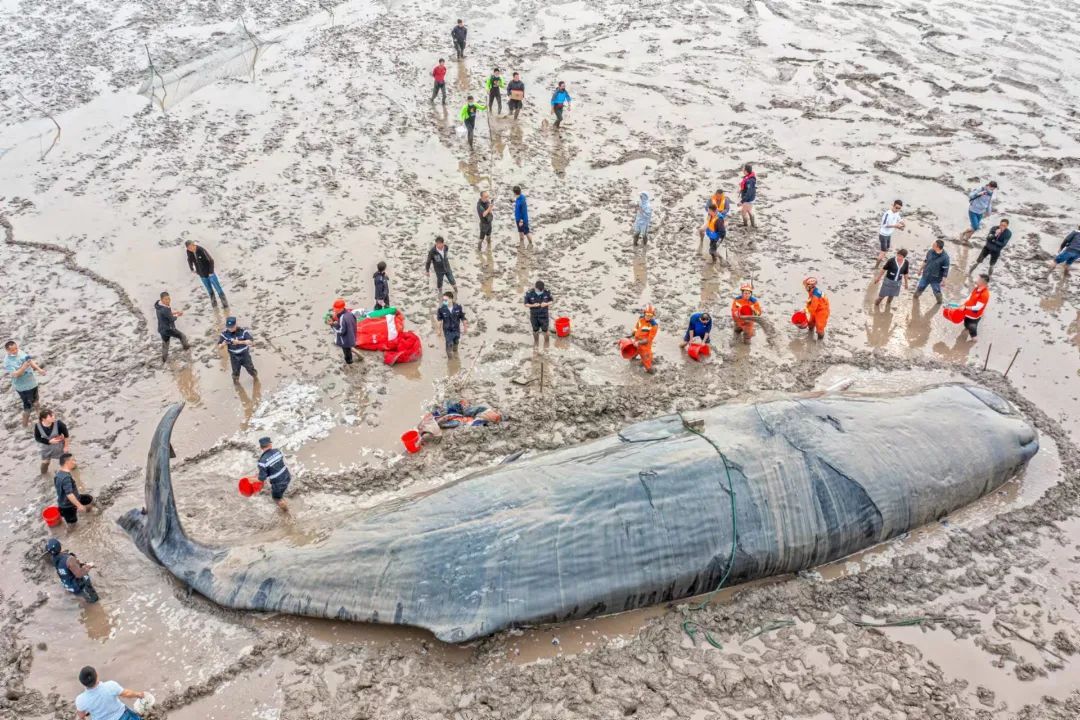“一方面要申请调来更多的力量支援,一方面潮水不断下降,我们船艇无法再靠近在鲸鱼身边继续救援。”倪建泉决定启动第二套应急方案——由滩涂人员徒步至鲸鱼身边,为鲸鱼实施保护性救援。