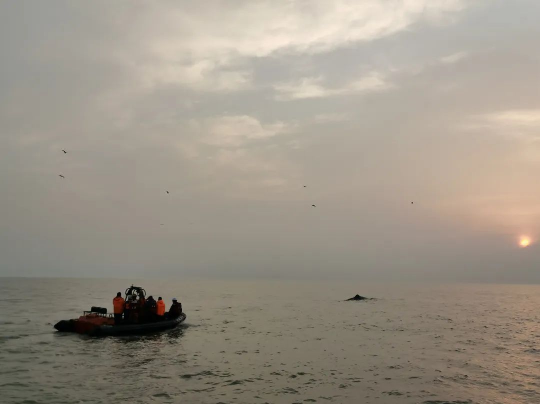 5时28分,割开鲸鱼尾部的绳索,送鲸入海。当时,执法船艇不放心离去,继续守护,远远在后方继续观察,鲸鱼能否能安全离去。“5时49分,巨鲸摇了摇尾巴,一下子就潜入了水中。当时,我感觉是它在我们说再见呢!”马孟华动情地说。