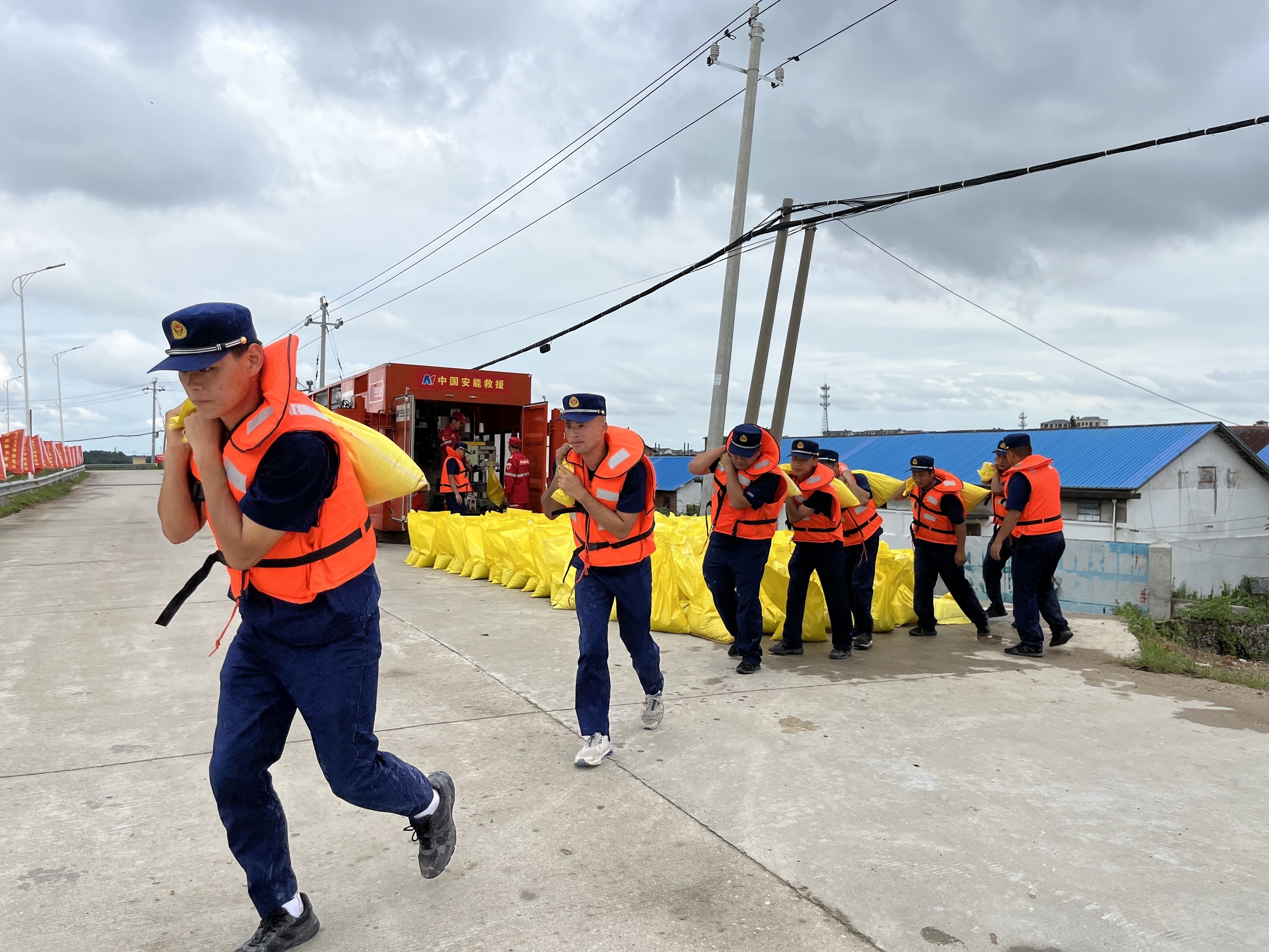 过程中,漫溢险情发生在即,需要及时构筑防汛安全长堤,中国安能救援队员和南昌县消防救援队伍正在运用挖掘机配合自动砂石打包机快速装沙封包,并运用装配式子堤连锁袋、组立式钢模子堤等装备器材快速加高加固子堤,处置漫溢险情。