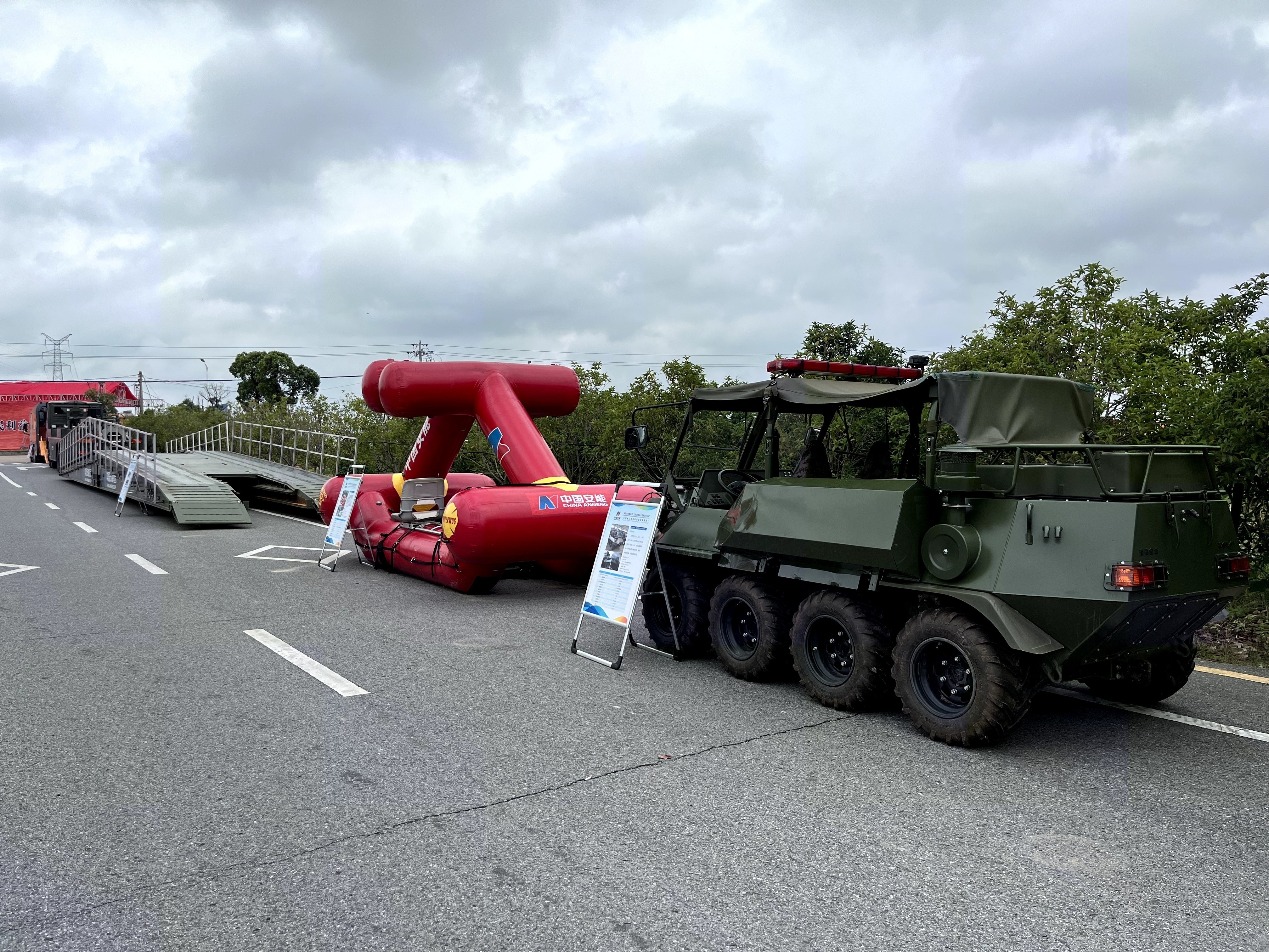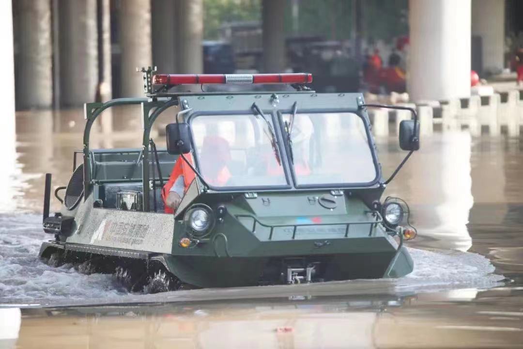 一款能在各种复杂地形自由行驶的水陆两栖全地形车,具有可靠性强、动力充沛、承载能力出色、越野能力优秀等特点。在抢险救援中,它可以穿梭于山地、丛林、沙漠、雪地,甚至应对台阶和地质灾害废墟也如履平地。其底盘是基于山猫的平台打造的,可以轻松爬上45度的陡坡。在进行洪涝灾害的救援行动时,因路面积水,通常的运输工具较难完全的稳定运输相关物资,水陆两栖全地形车能够在道路水深的状况下,顺利完成物资以及人员运送等问题。据介绍,这种全地形可用的“水陆两栖车”,可以在复杂的救援条件下,节省物资和伤员转运的时间。