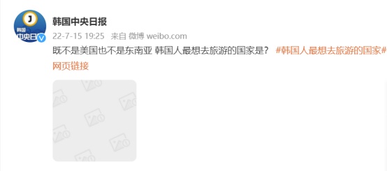 韩媒《中央日报》15日晚在其微博官方账号上发布了一条帖文,该帖文配图对中国台湾的表述在网络上引发巨大争议。在帖文内一张题为“(韩国人)想去旅行的国家”配图中,排名第7位的竟写的是“台湾”。不过环球网在16日上午对此事进行报道时,《中央日报》的这篇微博帖文已看不到,疑似删除。对此,韩国《中央日报》方面16日在回复环球网记者邮件提问时表示,事出社交媒体运营管理人员“失误”,称“未来会加强社交媒体运营管理工作,不再重犯类似错误”,并强调《中央日报》“始终尊重一个中国原则”。
