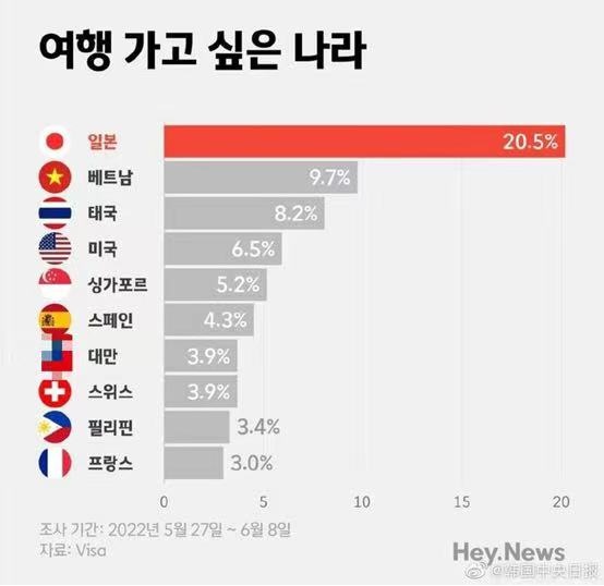 在帖文内一张题为“(韩国人)想去旅行的国家”配图中,排名第7位写的竟是“台湾” 图源:台媒《自由时报》