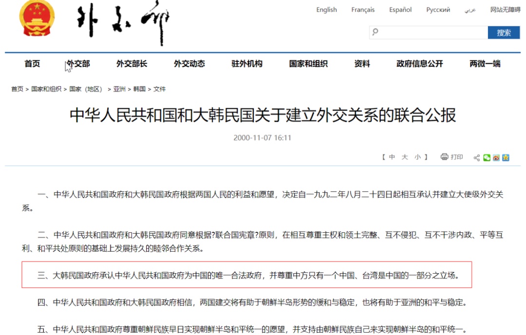 在《中华人民共和国和大韩民国关于建立外交关系的联合公报》中,明确写有:大韩民国政府承认中华人民共和国政府为中国的唯一合法政府,并尊重中方只有一个中国、台湾是中国的一部分之立场。