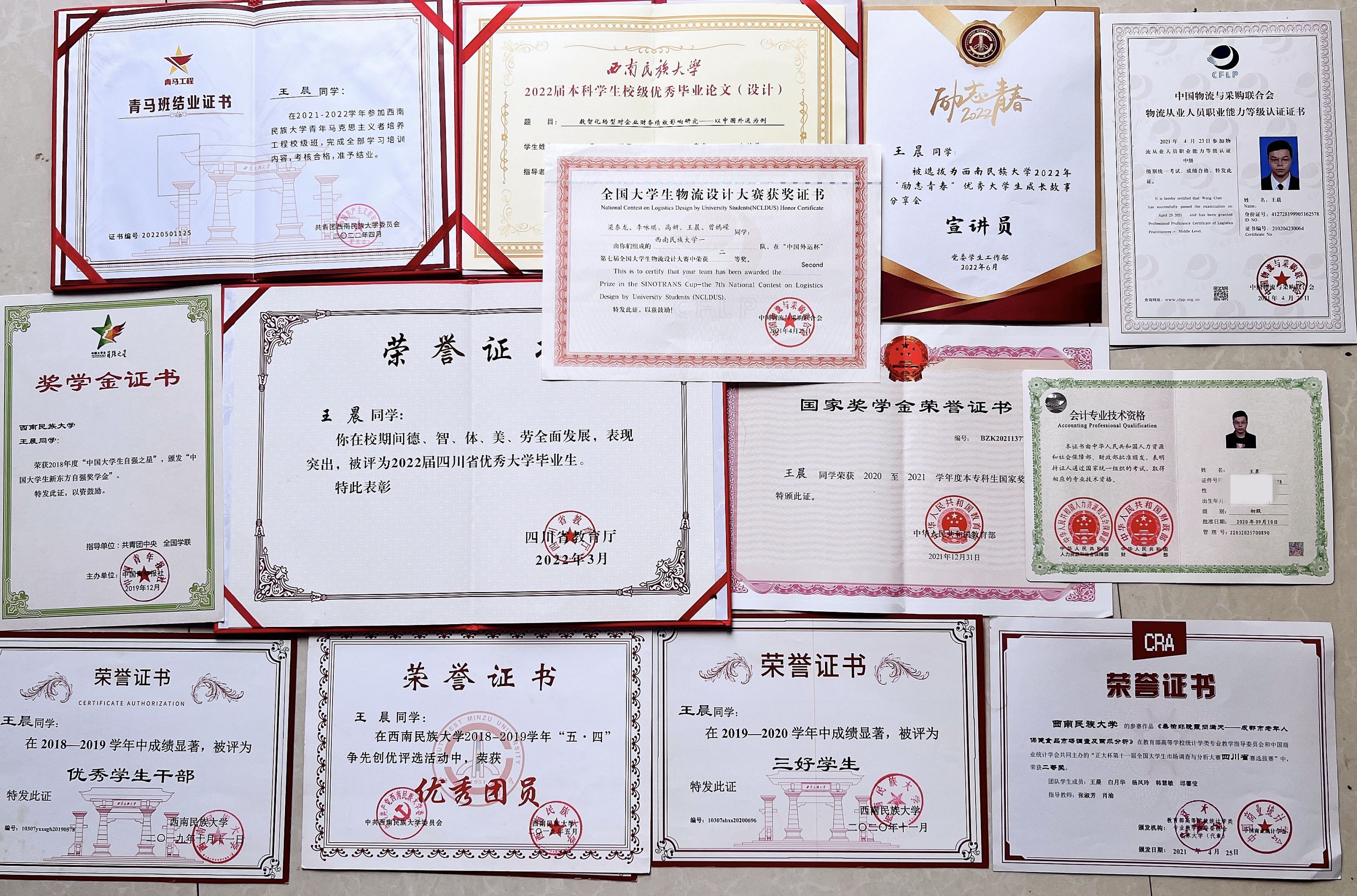 王晨获得的部分荣誉。(本人供图)