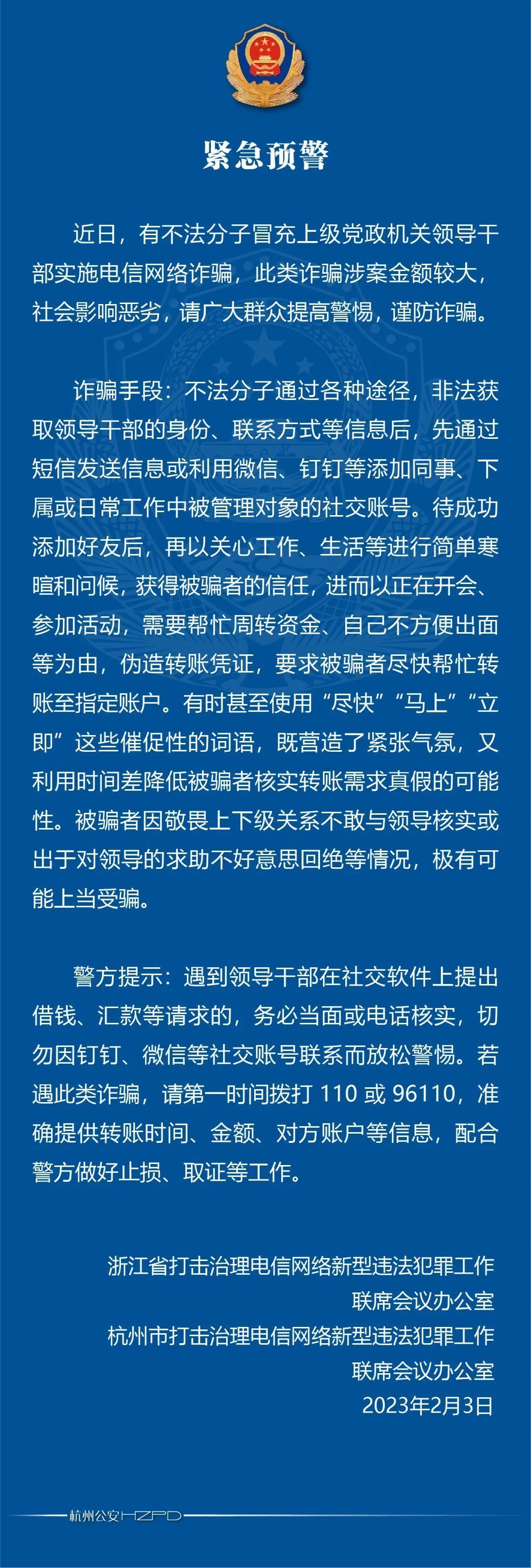 近日,有不法分子冒充上级党政机关领导干部实施电信网络诈骗,此类诈骗涉案金额较大,社会影响恶劣。2月3日,杭州、宁波、嘉兴等地公安发布紧急提醒。详情↓↓↓