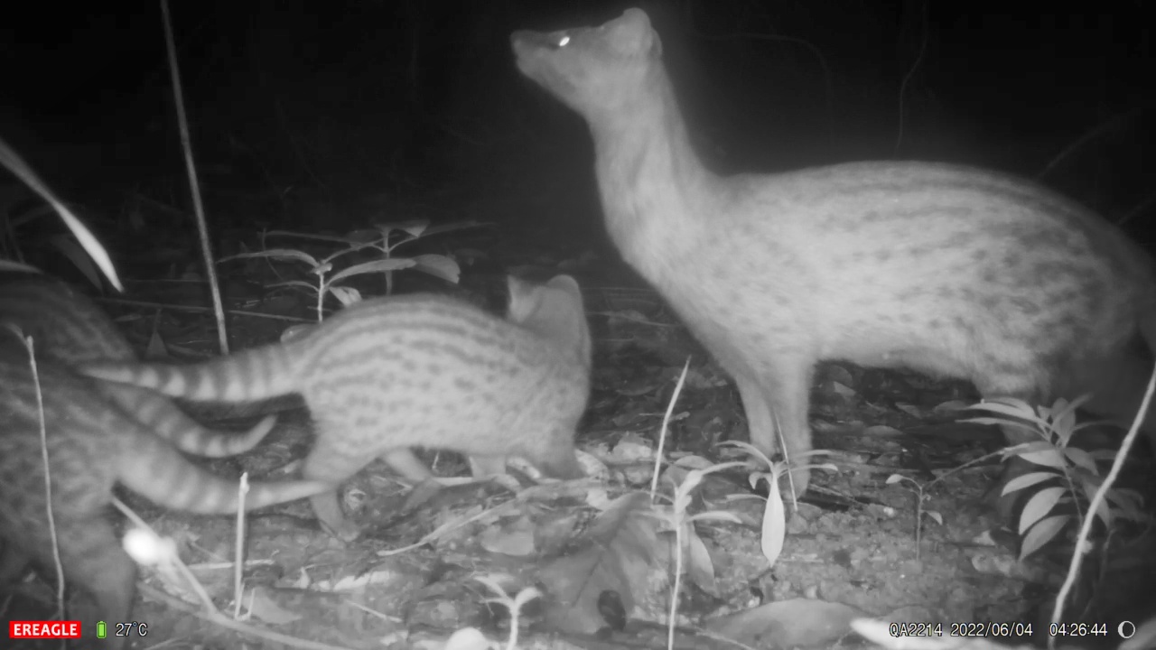 7月21日,记者从广东省林业局获悉,珠海淇澳-担杆岛省级自然保护区科研监测工作人员近日在回收红外相机数据时,惊喜地发现有两台红外相机分别拍摄到多只小灵猫同框活动的珍贵影像。其中一台红外相机拍摄的影像画面显示,夜幕下,三只小灵猫宝宝围绕在一只小灵猫身边,一蹦一跳的,显得很是活泼;另外一台红外相机也拍到了小灵猫一大带两小的画面。据悉,这是该保护区首次视频记录到小灵猫的育幼行为。