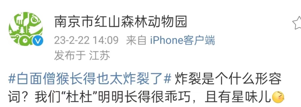 南京市红山森林动物园随后发文解释,照片中的是只名叫“杜杜”的白面僧面猴。对于网友的评论,红山动物园回应称:“炸裂是个什么形容词?我们‘杜杜’明明长得很乖巧,且有星味儿!”