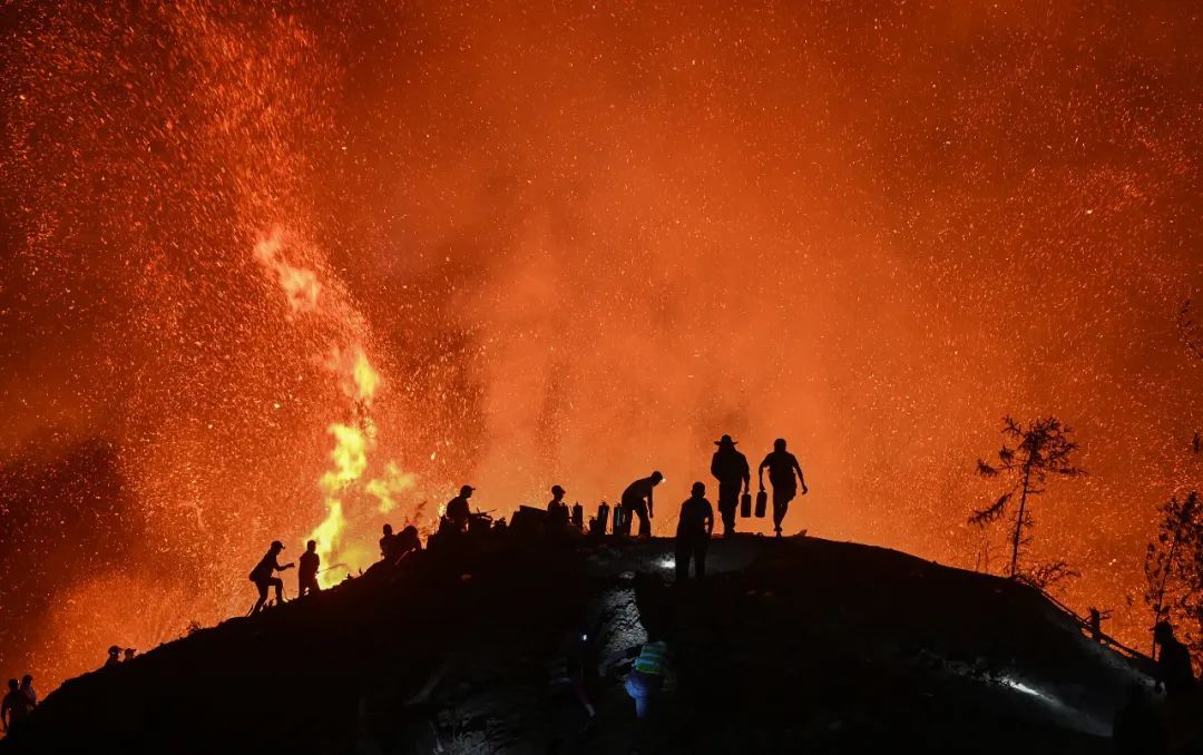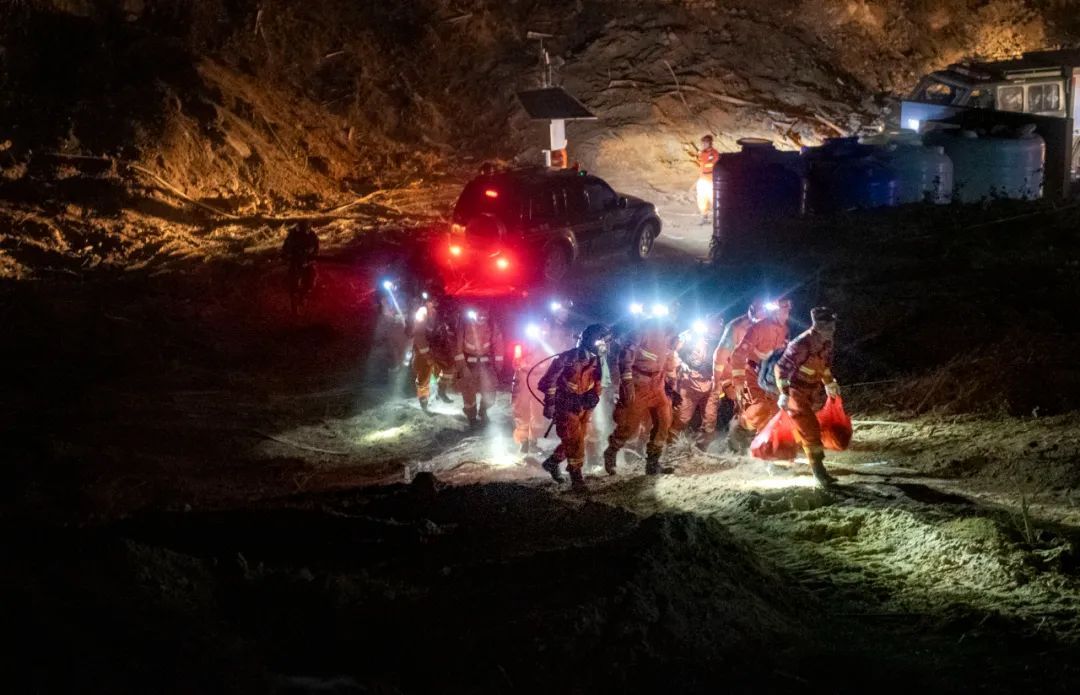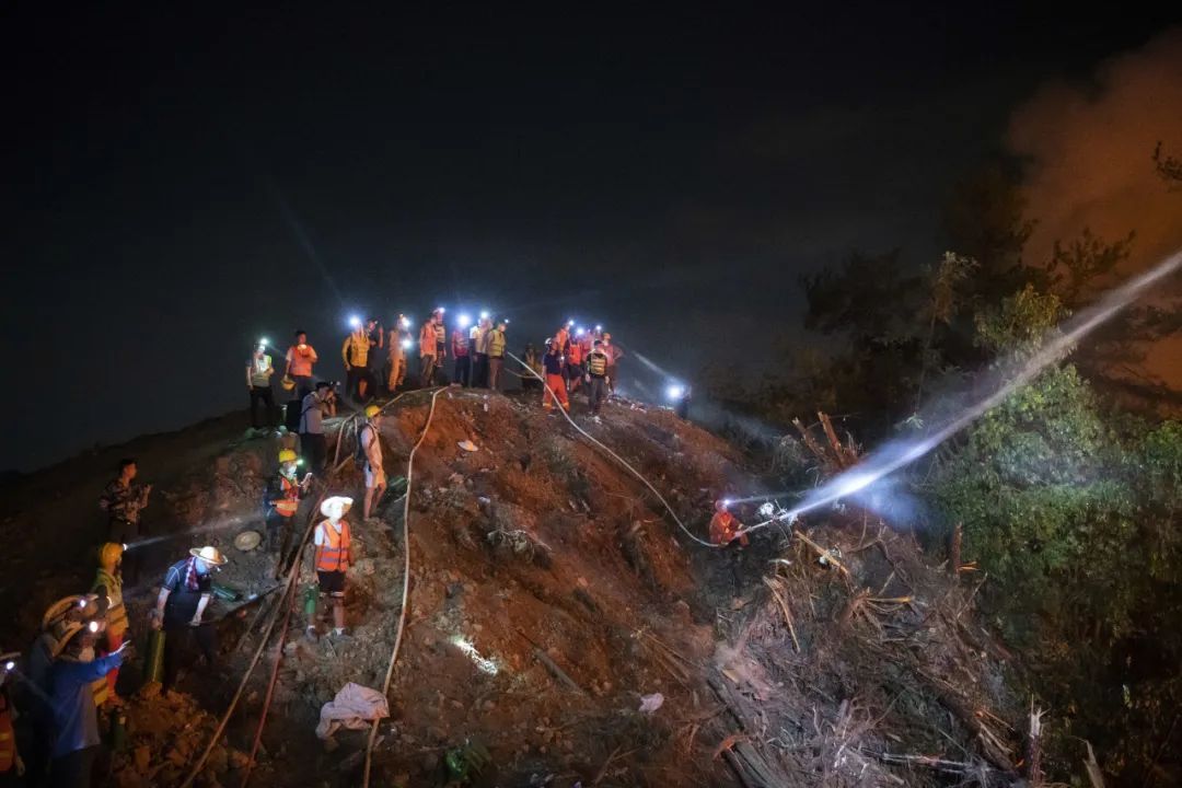 随着夜幕的降临,他们头上的头灯组成一道璀璨的银河,与不远处的山火交相辉映,让现场的气氛紧张到了极点。