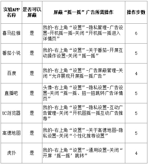 新江苏记者测试结果显示,喜马拉雅、番茄小说、百度、直播吧、UC浏览器、高德地图、虎扑等7款App已允许用户通过后台设置永久屏蔽“摇一摇”跳转广告,但关闭按钮隐藏较深,且操作步骤繁琐,用户需要经过4-6步方可完成。