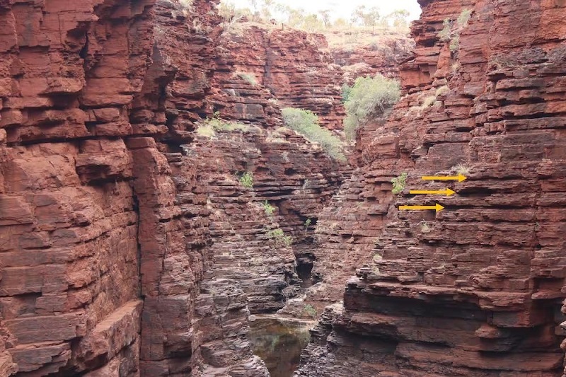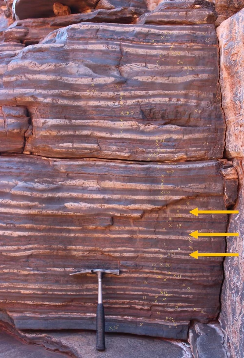 澳大利亚西部卡里吉尼国家公园的乔弗瑞峡谷,平均厚度为85厘米,呈现出红褐色、较硬的岩石和较软、富含粘土的岩石(如箭头所示)之间的规律交替。这些变化归因于地球轨道偏心率变化引起的过去气候变化。