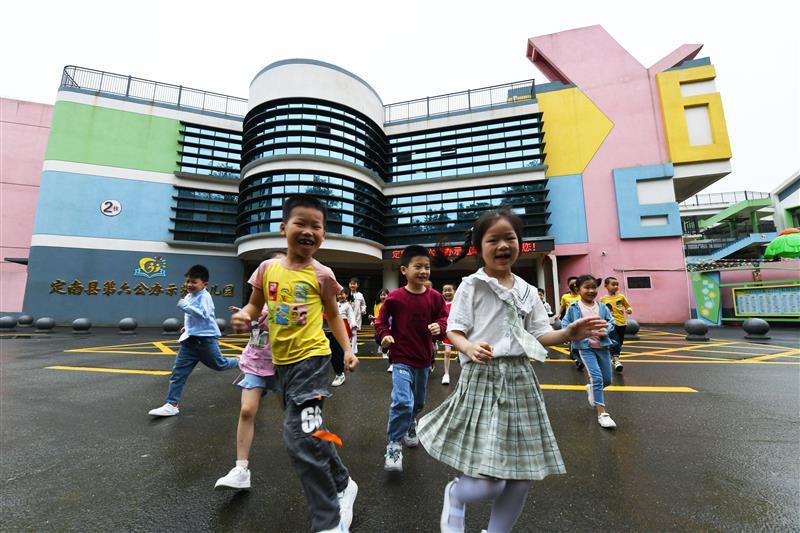 近年来,赣州市持续增加优质教育资源供给,推进学前教育普惠发展,新、改、扩建一批学校,大班额、大校额问题得到有效缓解,在全省率先实现每个乡镇建有一所公办中心幼儿园。图为定南县第六公办示范幼儿园的小朋友在开心奔跑。 张睿摄