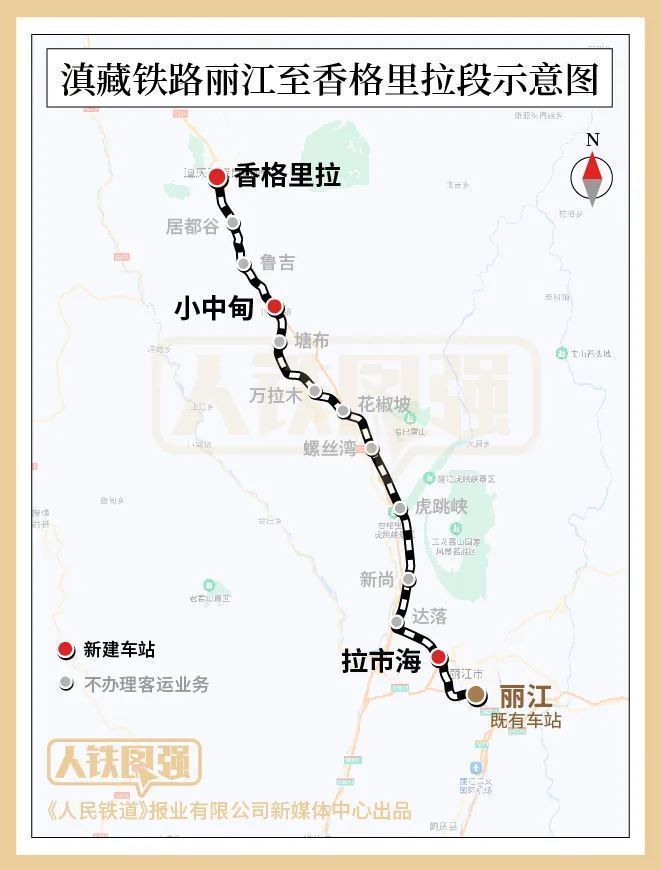 滇藏铁路丽香段南起滇藏铁路大丽段丽江站,向北于虎跳峡跨越金沙江,经小中甸至香格里拉,全长139.7公里。全线新建拉市海、小中甸、香格里拉站三座客运车站。