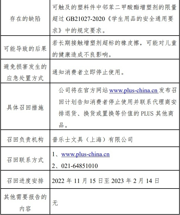 普乐士文具(上海)有限公司自2022年11月15日起,召回2019年5月26日至2021年5月28日期间生产的型号为36-428,共14个批次的“PLUS”WAIR-IN橡皮 36-428,涉及176000个。