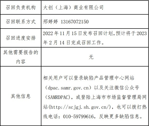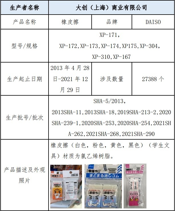 大创(上海)商业有限公司自2022年11月15日起,召回2013年4月28日至2021年12月29日期间生产的8种型号,共10个生产批号的“DAISO”橡皮擦,涉及27388个。