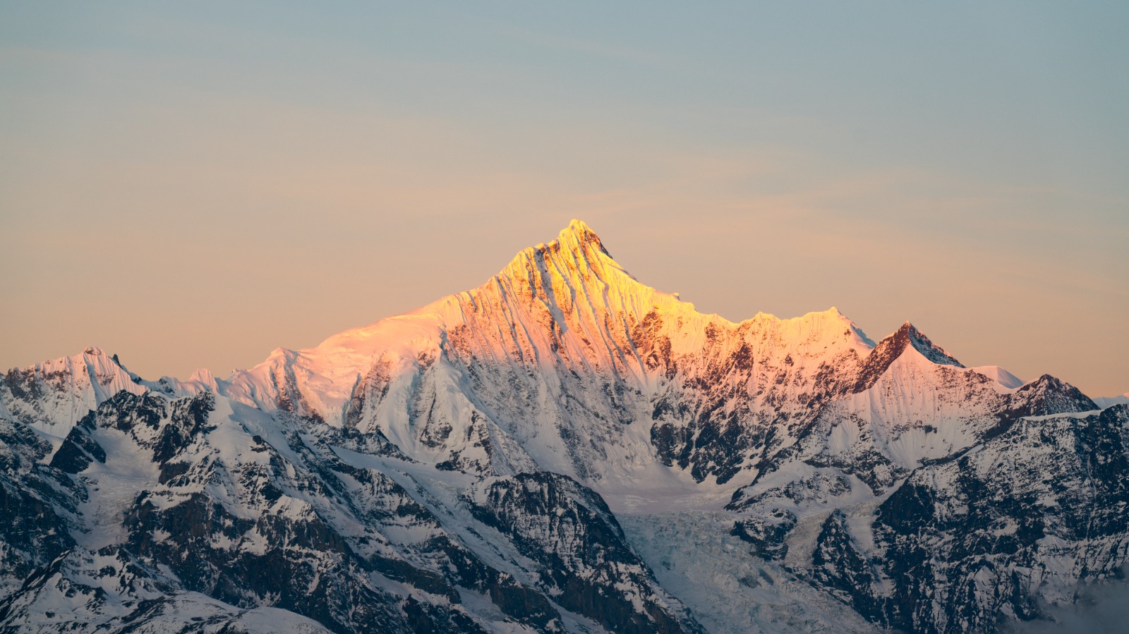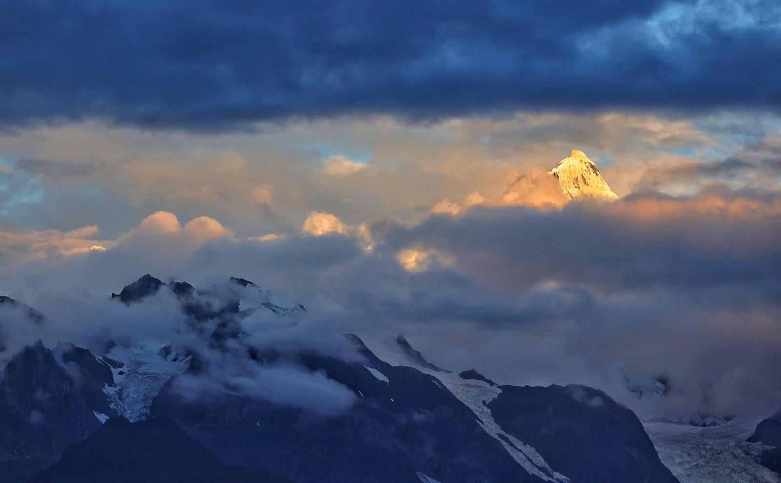 清晨,当白色雪山被彩霞笼罩,便是难得一见的日照金山之景,画面美到壮观。傍晚,彩霞飘过山顶,云雾缭绕变幻莫测,雪山又披上了五彩霞衣,云蒸霞蔚,气势恢宏。