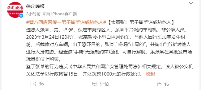 3月25日晚,《保定晚报》发文称,警方已回应“网传一男子掏手铐威胁他人”。