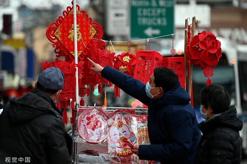 当地时间2023年1月20日,美国纽约皇后区法拉盛,华人华侨在法拉盛唐人街附近采购农历新年庆祝活动的用品。
