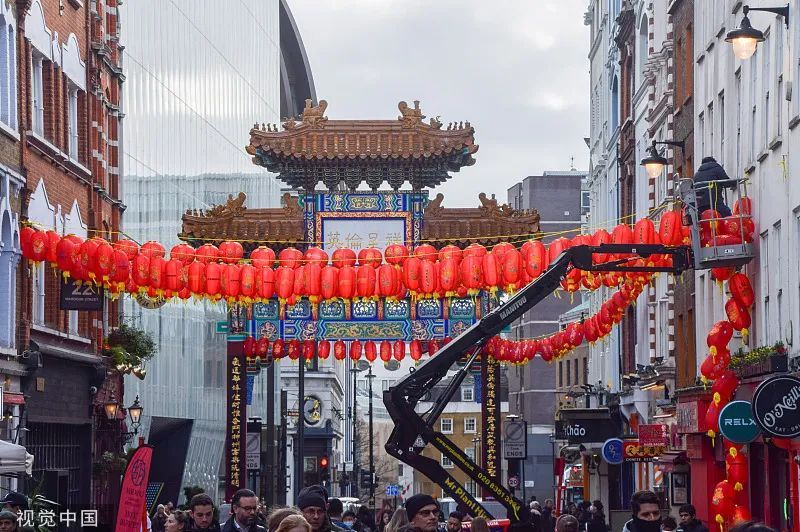 当地时间2023年1月13日,英国伦敦唐人街,工人在悬挂大红灯笼,庆祝即将到来的中国传统春节。