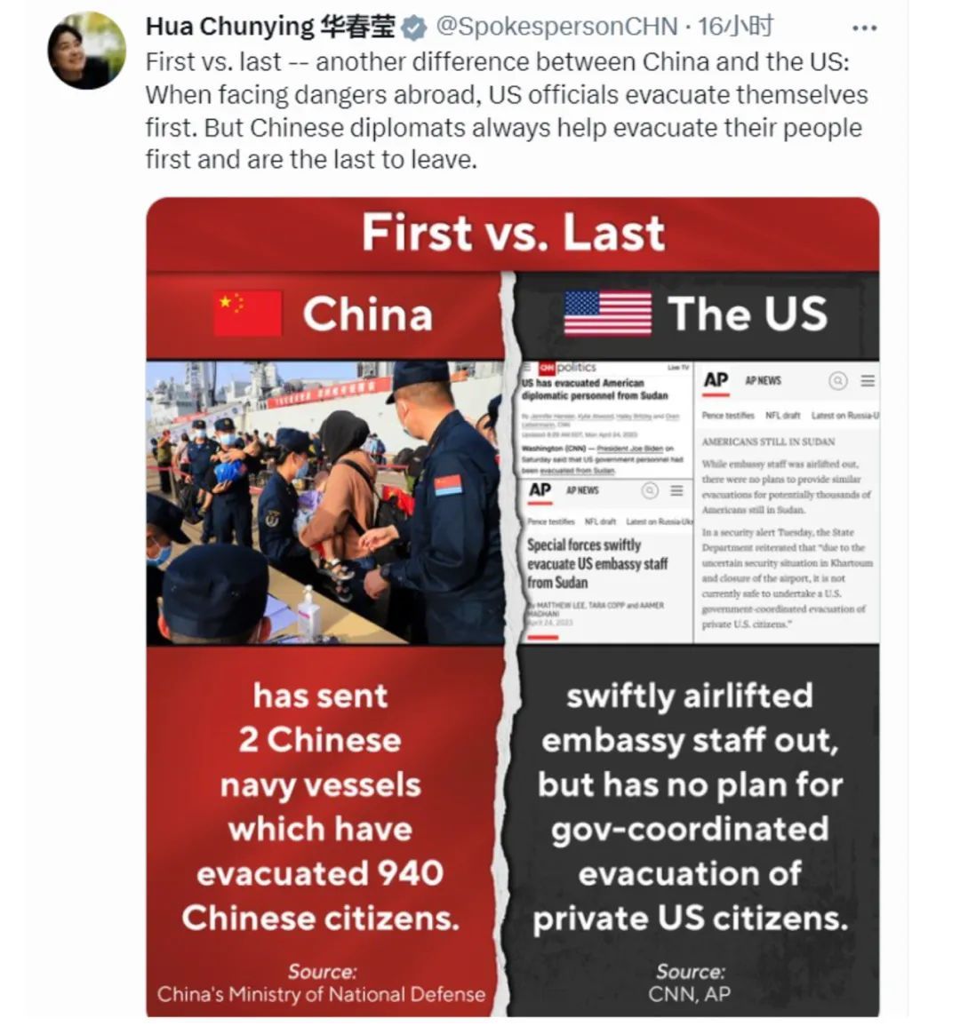 在配图中,华春莹还对比了中美两国从苏丹撤离本国人员时的不同表现:
