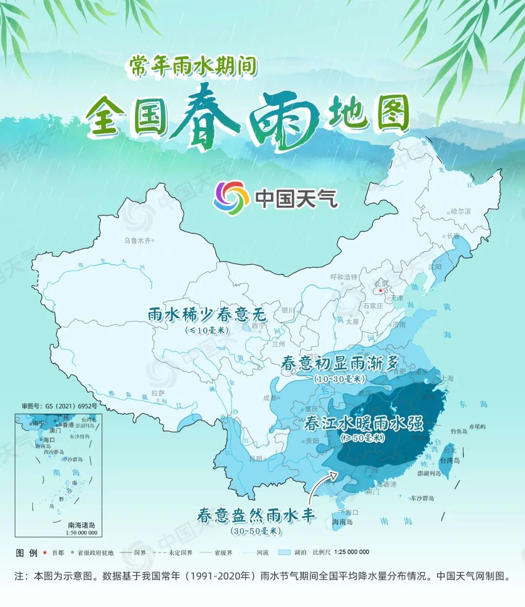 从中国天气网推出的全国春雨地图来看,常年雨水节气期间,安徽南部、浙江、江西、湖南中部和东部、广东北部、福建大部等地平均降水量超过50毫米,与立春节气相比雨量猛增。其中,浙江南部、江西中部和北部、湖南大部等地此时已进入气象学意义上的春天,可谓是真正的春江水暖雨水强。