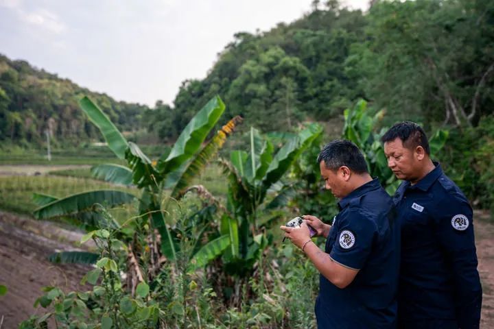 亚洲象监测员彭金福(左)和普永兵在云南省西双版纳州景洪市大渡岗乡大荒坝村使用无人机监测象群(5月11日摄)。新华社记者 胡超 摄